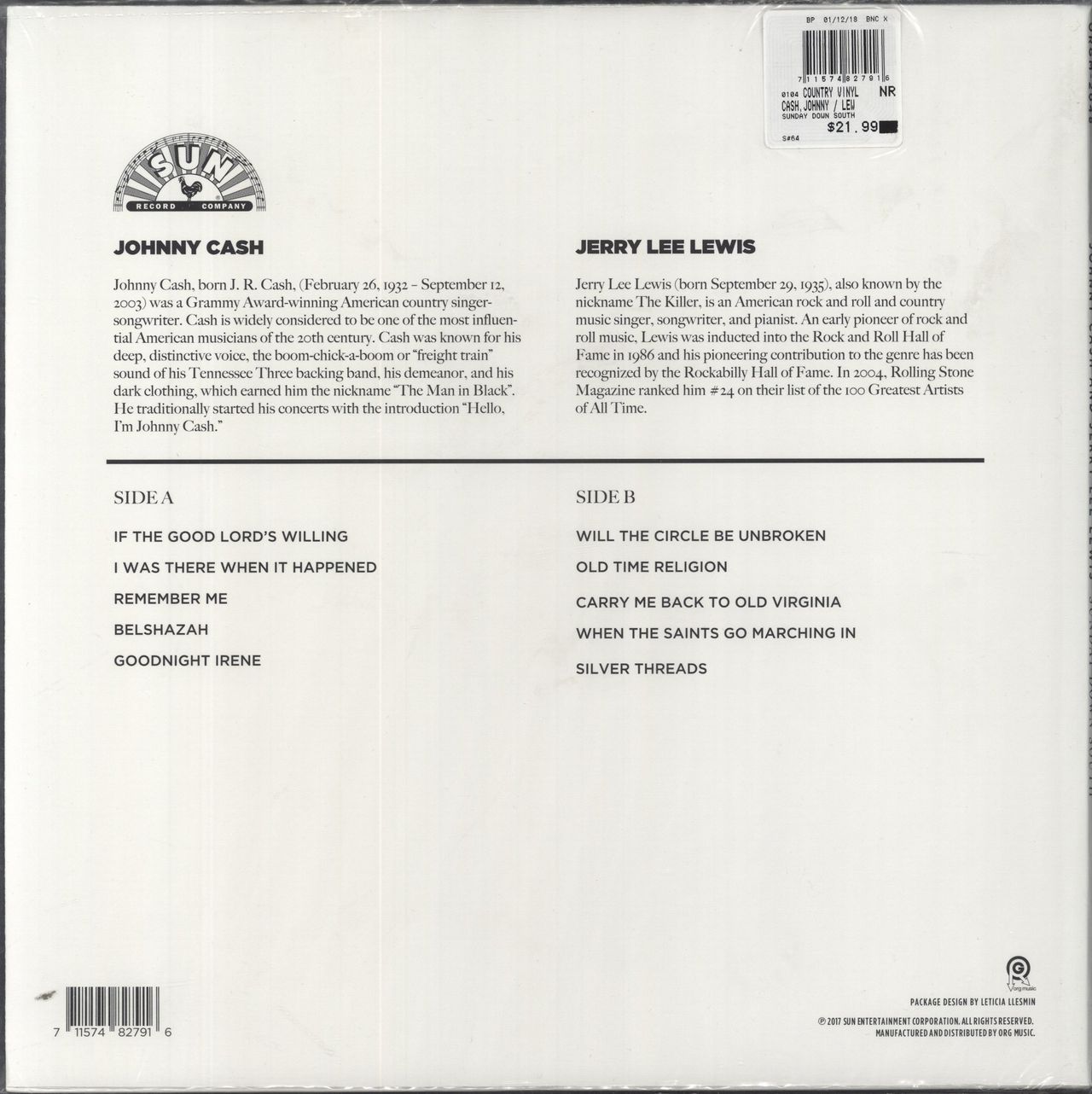 Johnny Cash Sunday Down South - White Vinyl - Sealed US Vinyl LP